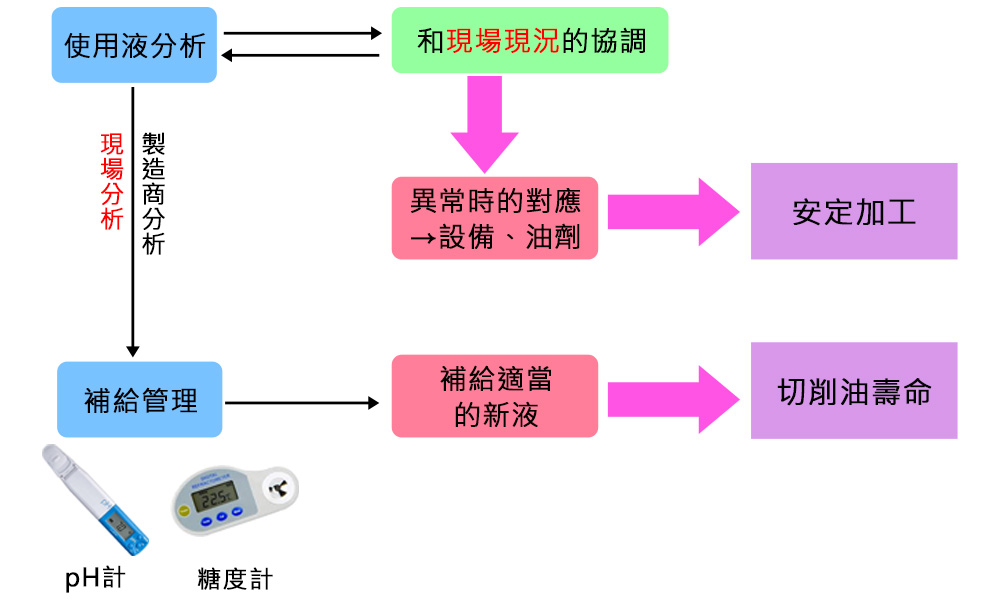 對使用中的水溶性切削油沒有做適當之管理的話切削油會急遽的劣化。