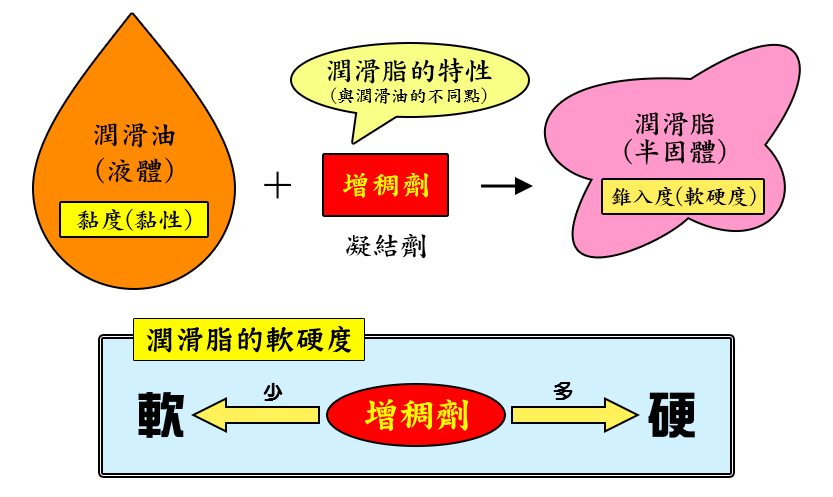 | 增稠劑 | 5~30% | 使潤滑油變成半固體狀或固體狀的物質 |