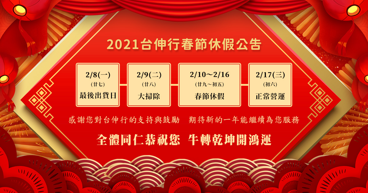 農曆新年即將到來,台伸行春節休假期間為:■年前最後出貨日:2/8 (一)